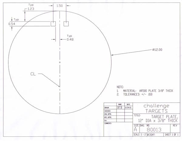 Target Plate Dimensions:  12″ diameter x 3/8″ thick