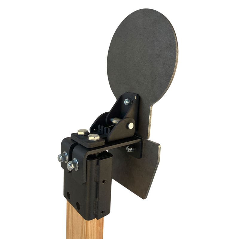 The base of the target incorporates an innovative four point stance which elevates the center of the target dispersing the weight to the four outer corners for excellent stability.  The stand legs include anchor holes for staking if extra stability is needed (stakes not included). The forward angle on the 2×4 post is adjustable between (5-20 degrees). The target plate, post and base all lock into place with no tools making it super easy to transport and set-up on the range.