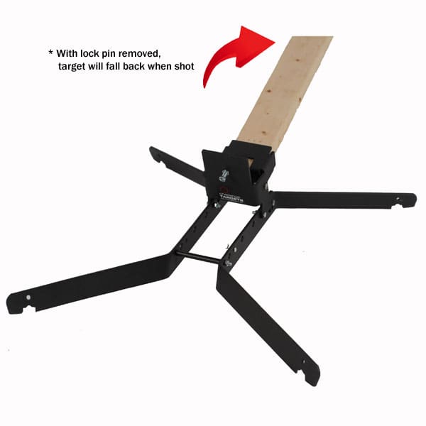 Our Heavy Duty Pivot Stand is designed to be used with a steel target (sold separately). The stand includes a pivot mechanism and lock pin which allows rotational movement of the target. With the lock pin engaged, the target bounces back when shot then resets to the forward leaning position. With the lock pin removed, the target falls completely down when shot. The front screw allows the shooter to adjust the forward lean and sensitivity of the target. With a mild forward lean, the stand can be set to fall with a .22 caliber hit. With a steep forward lean, the stand can be set so multiple hits are required with .45 ACP. The innovative four point stance elevates the center of the stand so the weight is supported by the outer contact points. This reduces wobble and provides stability on uneven terrain. The stand legs are notched for staking if extra stability is needed (stakes sold separately). The Heavy Duty Stand accepts standard wood 2×4 posts that can be cut to your desired length and changed out in seconds without any tools.
