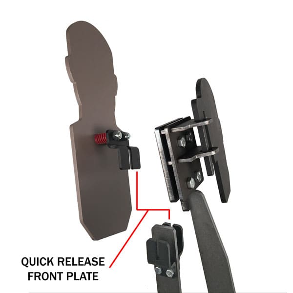 We believe we have designed the ultimate reactive steel hostage target. To our knowledge, it is the only target of this type that functions reliably with both handguns and large caliber rifles. Our unique design utilizes two separate 3/8″ AR500 upright posts so the front plate (hostage) and the hinged head plate (hostage taker) are mounted independently. This prevents “false hits” that are common with other target systems. Missed shots that hit the perimeter of the front plate will not flip the head paddle.